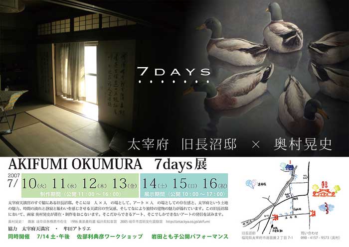 そもそも7days展は太宰府で出会った人たちとの交流のなかから企画が生まれました。 昨年2006年4月末に初めて太宰府に行き、滞在をしましたが、その時は画家としての交流はできませんでした。しかしアートを通じて触れ合った人たち、牟田アトリエや太宰府天満宮の一部人たちはその後、ネットなどを通じて私の作品に関心を持ってくれました。私の地元、岐阜でも作品を見ていただく機会もあり、いよいよ太宰府での作品発表の機会を作ろうと思い立ったのです。 その発表の場所として、現地視察も行い、旧長沼邸に決めました。今年3月のことです。 天満宮の所有である旧長沼邸を使うにあたり、ただ、もってきた絵を飾るだけではない、プラスアルファ、できれば太宰府という土地との関連をなにかして欲しい。そうすれば天満宮の協力もしやすい。 というようなアドバイスをいただきました。 また、私の絵がいったいどうやって描いているのか、見てみたい。というような言葉も記憶に残りました。 私個人としても、絵を飾るだけであとは画廊任せ、というような展覧会はこの場合ふさわしくない、とも思いました。 |