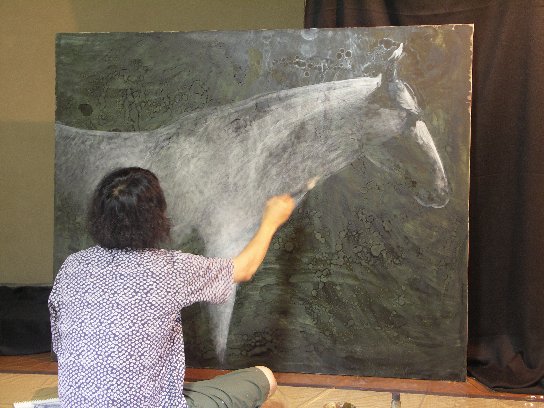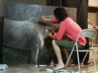 そして考えたのがこの7daysの企画です。 4日間制作、3日間展示、そしてすべての期間を公開するという単純な企画。 しかし、制作はやはりある程度の大作でなければ意味がないと思いました。私の画風は描きこみが生命線ですので、やや無謀な挑戦になりかねないのですが、いい作品ができなければ展覧会そのものが失敗する・・ なんか、ワクワクするではないですか。 現地の空気と緊張感が作品を生み出してくれる、そんな期待感もありました。 |