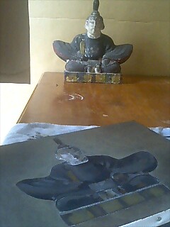 白梅号を描くとき、うしろには数体の菅原道真公の土人形がありました。なんとなく気になっていたのと、小さめの作品も描きたいと思っていたので制作をはじめました。描けるところまでで、あとは岐阜で仕上げよう、そんな感じで始めました。 展覧会を見に来た地元のひとが、これは長沼さんが集めていたものだと教えてくれました。 これを描いているのをみた、天満宮の馬場さんが、天満宮内の菅公記念館にこんなのがいっぱいあると教えてくれました。この人形のよび方、・・・人形とか・・・像とかを知りたかったので今度行ってみよう、と思いました。 |