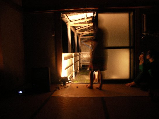 その夜、岩田ともこのパフォーマンスが行われました。彼女は自分のルーツや存在を掘り下げていくようなパフォーマンスや、作品をつくっています。 今回は自ら撮影した映像と演説、石を投げる行為で私たちをなにかしらの目撃者に仕立て上げたのでした。 東京芸大の大学院に在籍しています。昨年太宰府で知り合い、岐阜にも何度か来ています。 台風は去っていました。 |