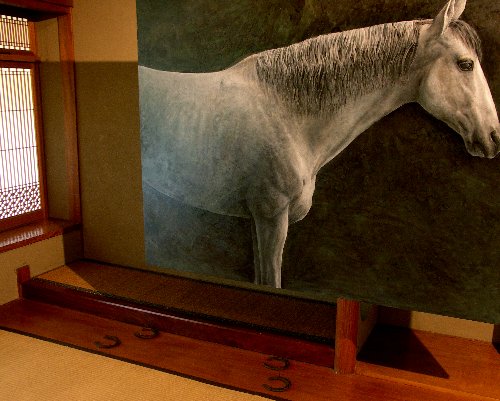 白梅号の作品の足元には、蹄鉄を配置しました。 会場は完成しましたが、不安材料がまたひとつ。台風です。名前はマンニィ。暴風警報発令! いろいろな人に来て欲しいかったのですが、マンニィちゃんまで来てくれるとは・・・ そしてこの日は牟田アトリエ×佐部利典彦ワークショップが計画されています。計画では庭で大騒ぎアートワークショップなのですが・・・ |