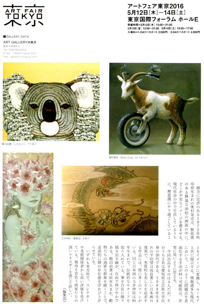 アートフェア東京2016に出品いたします。今回はART GALLERY 水無月のブースに数点と100KINという企画ブースに1点展示されております。前日の水曜日のプレビューと初日木曜日に会場にてうろうろしております。