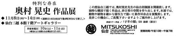 東京の百貨店では初めて個展ができることになりました。油彩の大作から小品まで約30点の展示をいたします。私も前半は東京さ行ってきます。見るのは無料ですので是非穴が開くほどみてやってください。現在の私の仕事を見せられたらと思っております。よろしくどうぞ。