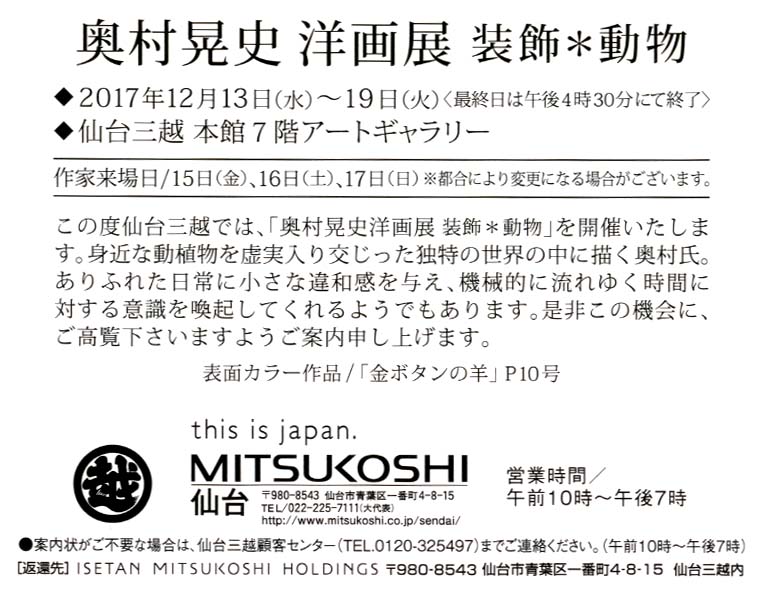 4年ぶり?5年ぶり?の仙台での個展を開催します。寒いんでしょうか。寒いんでしょうね。岐阜も充分寒いのですが、今回は装飾をテーマにして草食動物の油彩作品を中心に展示いたします。どうぞ着飾ってデパートショッピングの合間に寄ってください。